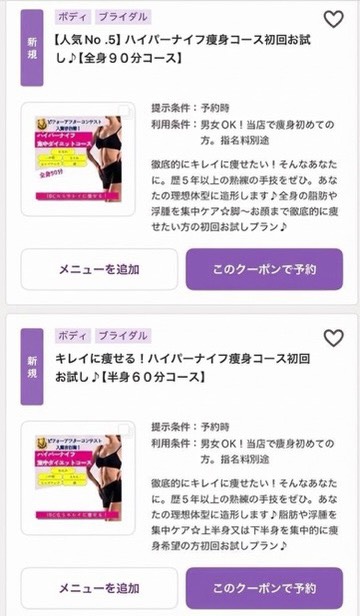 ご予約の際は「エステ」ジャンル「痩身」の中の「ハイパーナイフ」のメニューからお選びください。